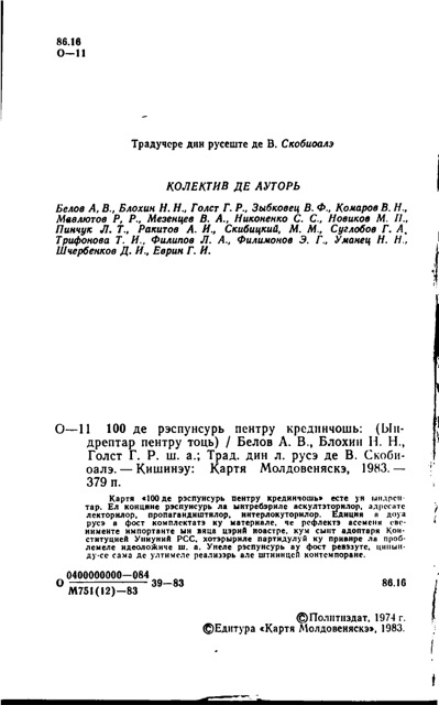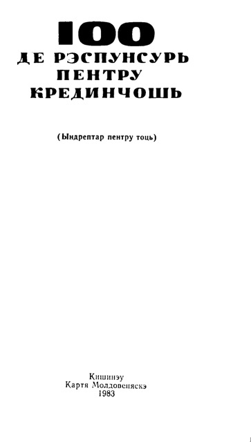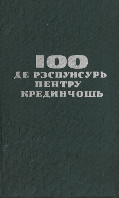 Картя «100 де рэспунсурь пентру крединчошь» есте ун ындрептар. Ел концине рэспунсурь ла ынтребэриле аскултэторилор, адресате лекторилор, пропагандиштилор, интерлокуторилор. Едиция а доуа русэ а фост комплектатэ ку материале, че рефлектэ асеменя евенименте импортанте ын вяца цэрий ноастре, кум сынт адоптаря Конституцией Униуний РСС, хотэрыриле партидулуй ку привире ла проблемеле идеолоӂиче ш. а. Унеле рэспунсурь ау фост ревэзуте, цинынду-се сама де ултимеле реализэрь але штиинцей контемпоране.