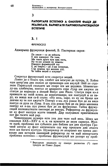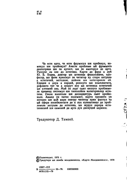 Че есте арта, че есте фрумосул ши орибилул, комикул ши траӂикул? Ачесте проблеме ый фрэмынтэ деопотривэ ши пе артист, ши пе аматорул де артэ. Рэспунс ла еле дэ естетика. Картя де фацэ а луй Ю. Б. Борев, доктор ын штиинце филолоӂиче, професор, ыл фаче куноскут пе чититор ку старя актуалэ а естетичий, методеле, леӂиле ши категорииле ей. Едиция а доуа а кэрций, ревэзутэ ши комплектатэ, рефлектэ тот че а апэрут ноу ын штиинца естетичий ын ултимий ань. Май пе ларг сынт експусе проблемеле привинд системул ши типолоӂия категориилор естетиче. Унеле капитоле ши деспэрцитурь сынт ориӂинале. Авынд ун патос полемист, картя презинтэ ун интерес ши май маре пентру чититор прин фаптул кэ ый оферэ посибилитатя де а луа куноштинцэ де проблемеле актуале де естетикэ, ын журул кэрора естетичиений ши оамений де артэ дук дискуций апринсе.