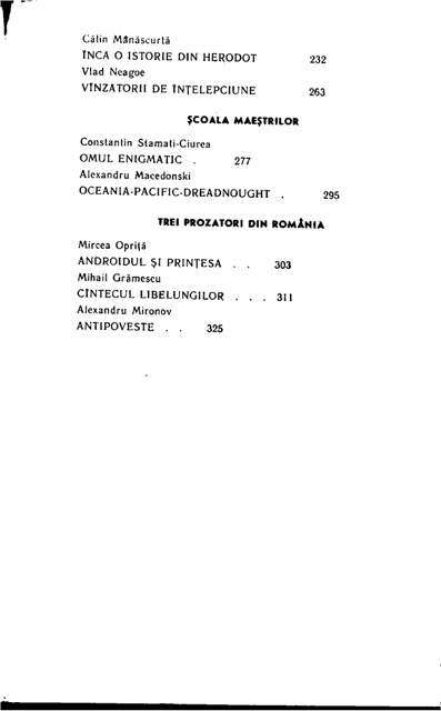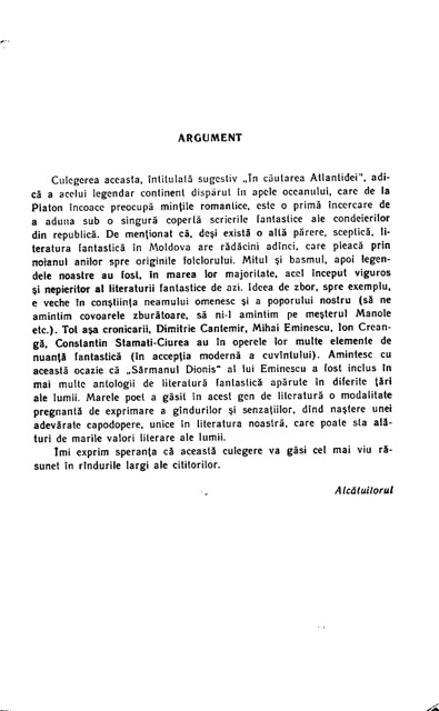 Culegerea aceasta, întitulată sugestiv „în căutarea Atlantidei”, adică a acelui legendar continent dispărut în apele oceanului, care de la Platon încoace preocupă mințile romantice, este o primă încercare de a aduna sub o singură copertă scrierile fantastice ale condeierilor din republică. De menționat că, deși există o altă părere, sceptică, literatura fantastică în Moldova are rădăcini adînci, care pleacă prin noianul anilor spre originile folclorului. Mitul și basmul, apoi legendele noastre au fost, în marea lor majoritate, acel început viguros și nepieritor al literaturii fantastice de azi. Ideea de zbor, spre exemplu, e veche în conștiința neamului omenesc și a poporului nostru (să ne amintim covoarele zburătoare, să ni-1 amintim pe meșterul Manole etc.). Tot așa cronicarii, Dimitrie Cantemir, Mihai Eminescu, Ion Creangă, Constantin Stamati-Ciurea au în operele lor multe clemente de nuanță fantastică (în accepția modernă a cuvîntului). Amintesc cu această ocazie că „Sărmanul Dionis“ al lui Eminescu a fost inclus în mai multe antologii de literatură fantastică apărute în diferite țări ale lumii. Marele poet a găsit în acest gen de literatură o modalitate pregnantă de exprimare a gîndurilor și senzațiilor, dînd naștere unei adevărate capodopere, unice in literatura noastră, care poate sta alături de marile valori literare ale lumii.